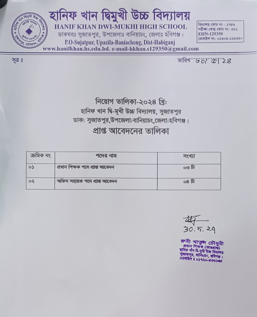 নিয়োগ বিজ্ঞপ্তি হানিফ খান দ্বি-মূখী উচ্চ বিদ্যালয়, সুজাতপুর,বানিয়াচং, হবিগঞ্জ।